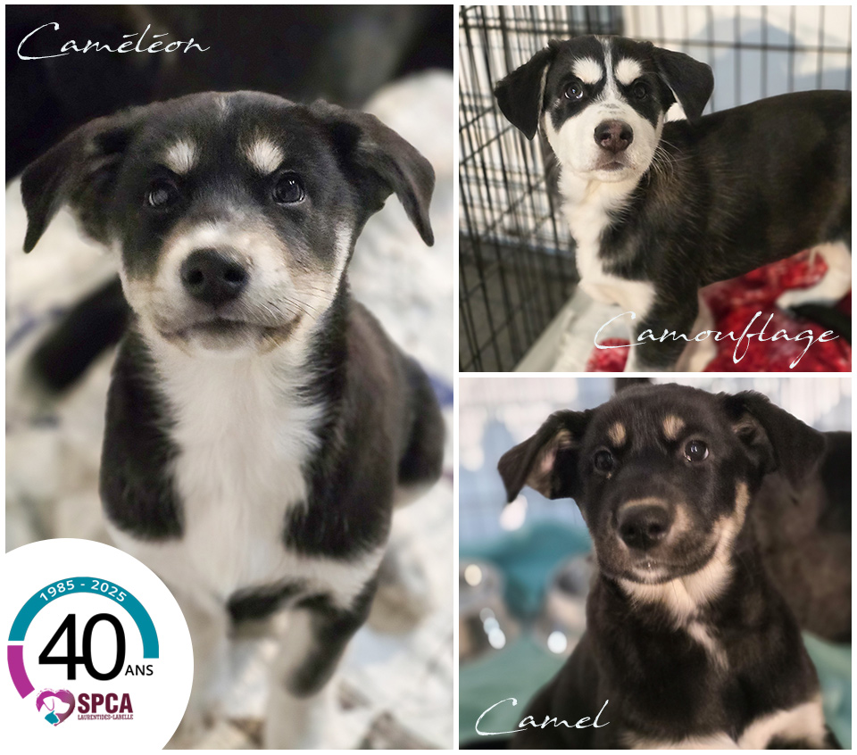 Caméléon (mâle), Camouflage (mâle) et Camel (femelle) sont des croisements probablement de husky,...